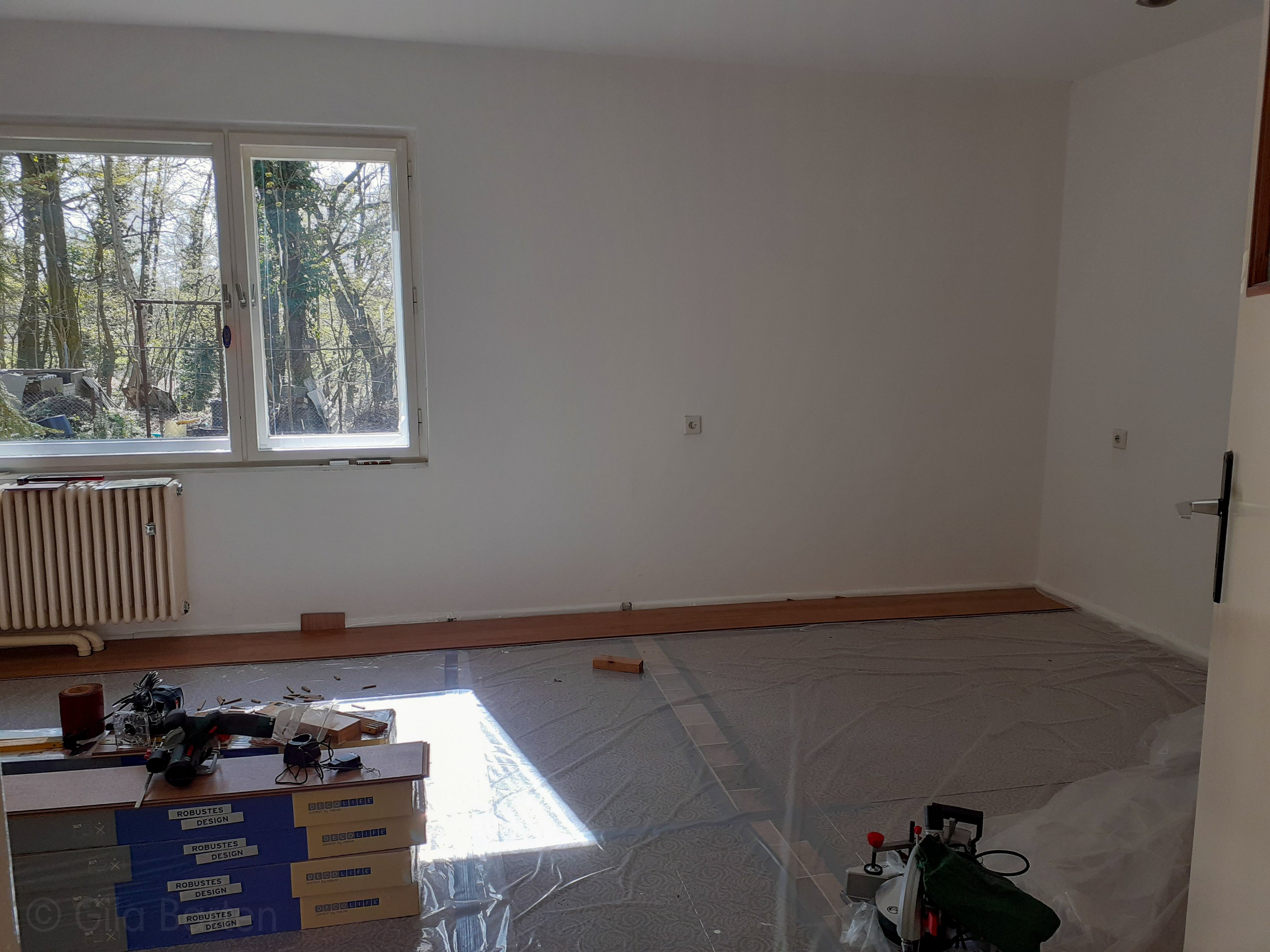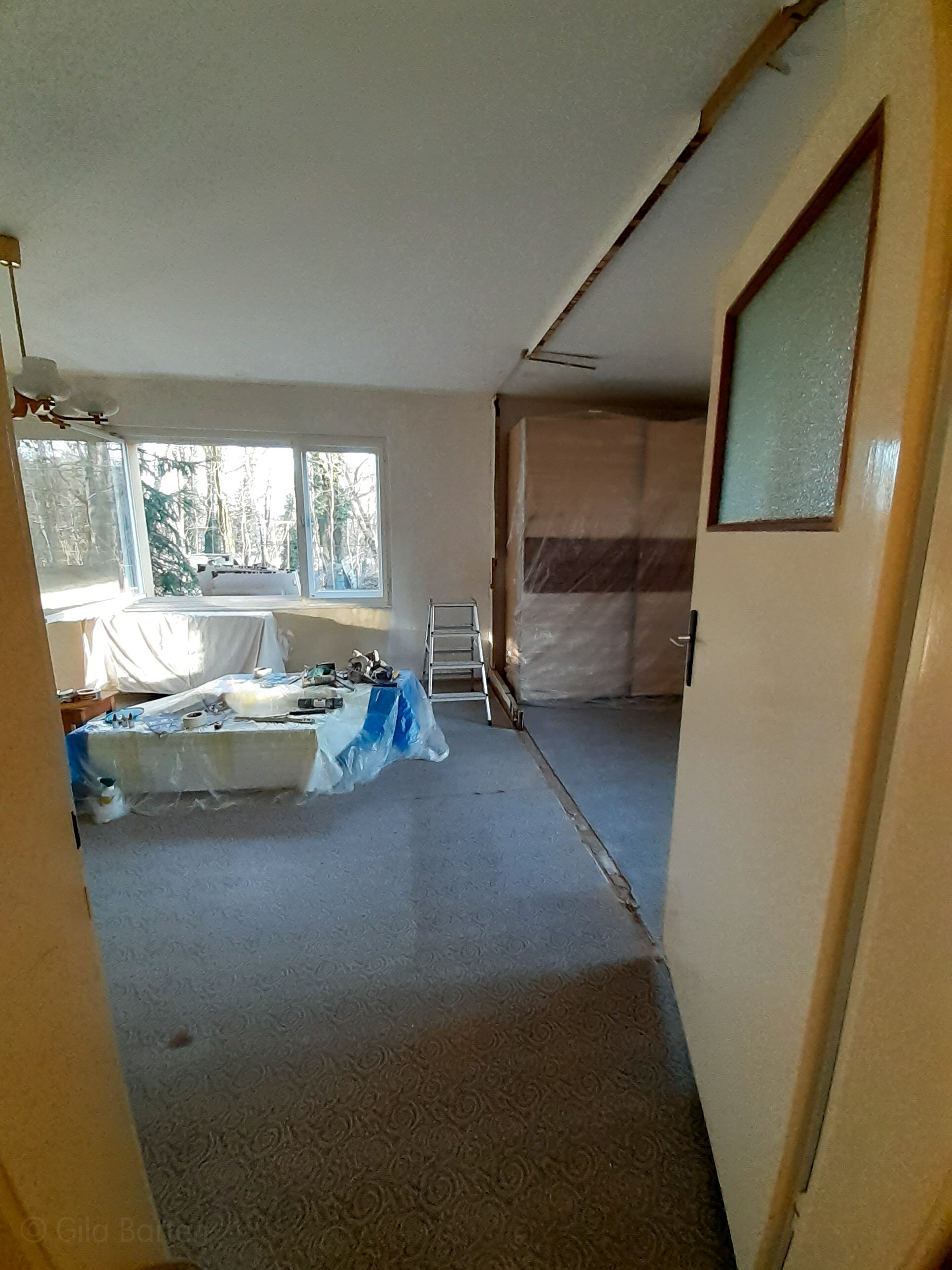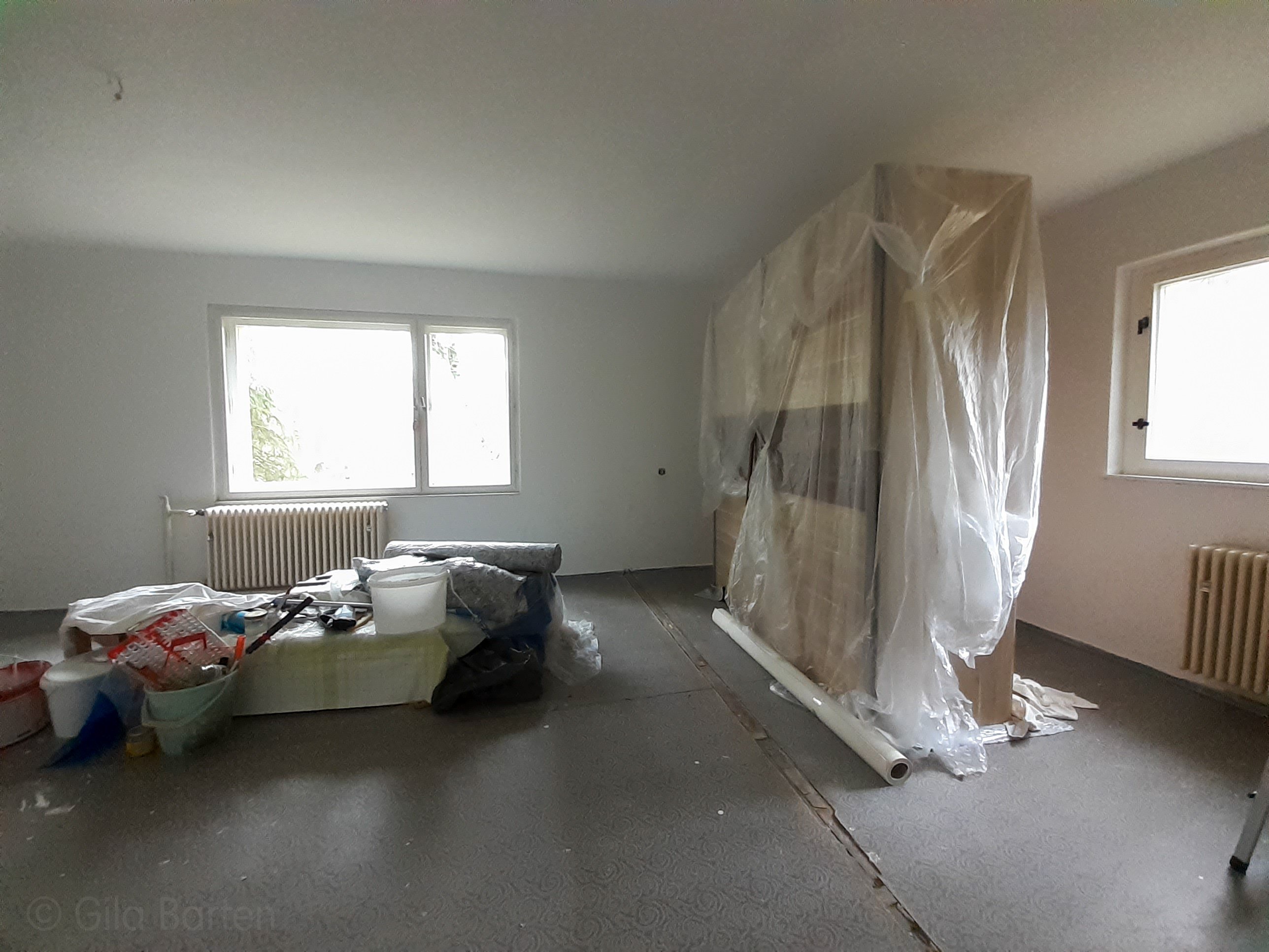 Hier war der Raum nicht mehr so schön und mit einer Wand geteilt, die nun weg ist. Decke und Wände sind angearbeitet und ein neuer Boden verlegt. Mit der Sonne, die durch zwei Fenster aus jeweils unterschiedlichen Himmelsrichtungen herein scheint, ist es ein schöner und „wohliger“ Raum geworden