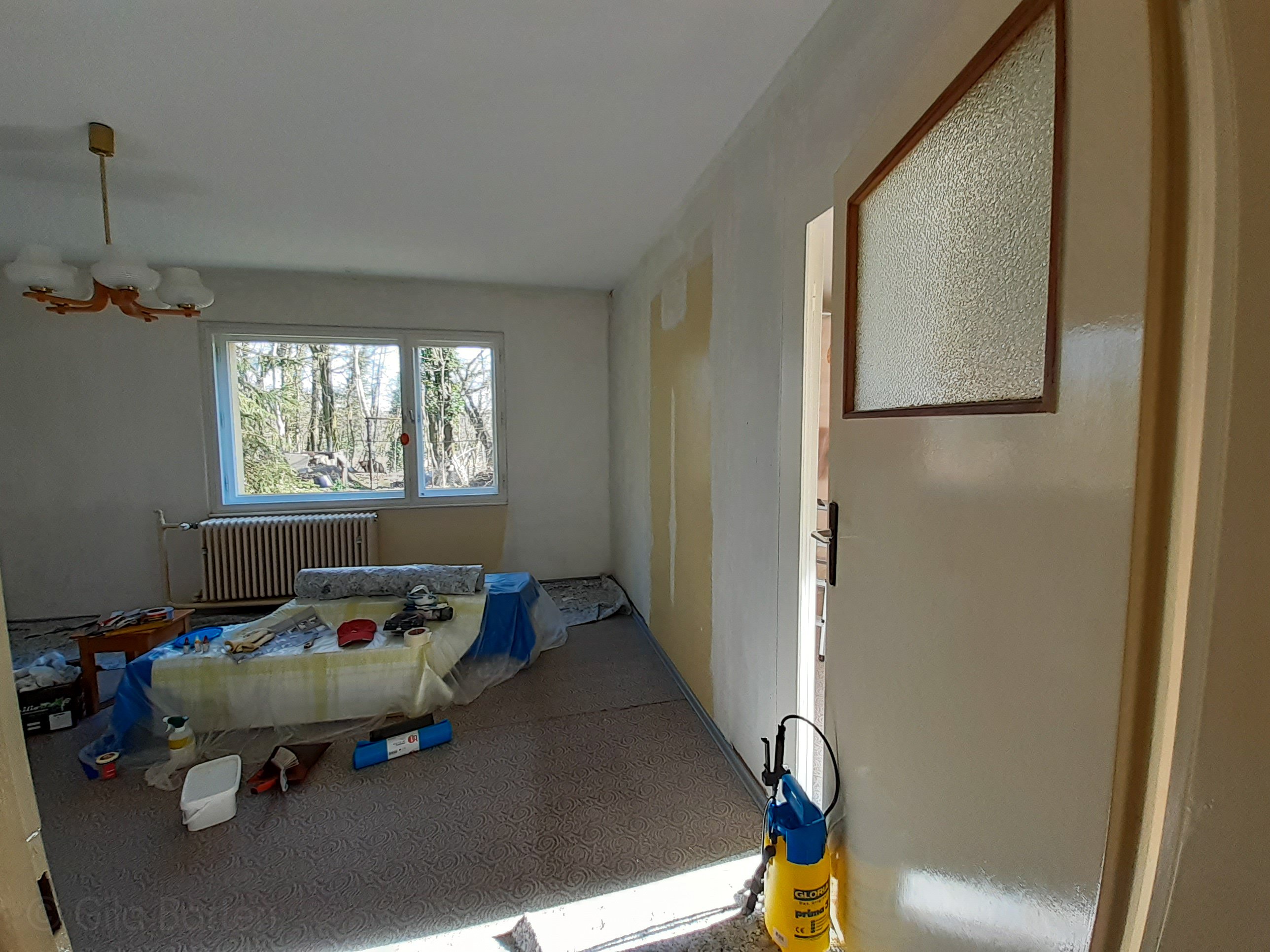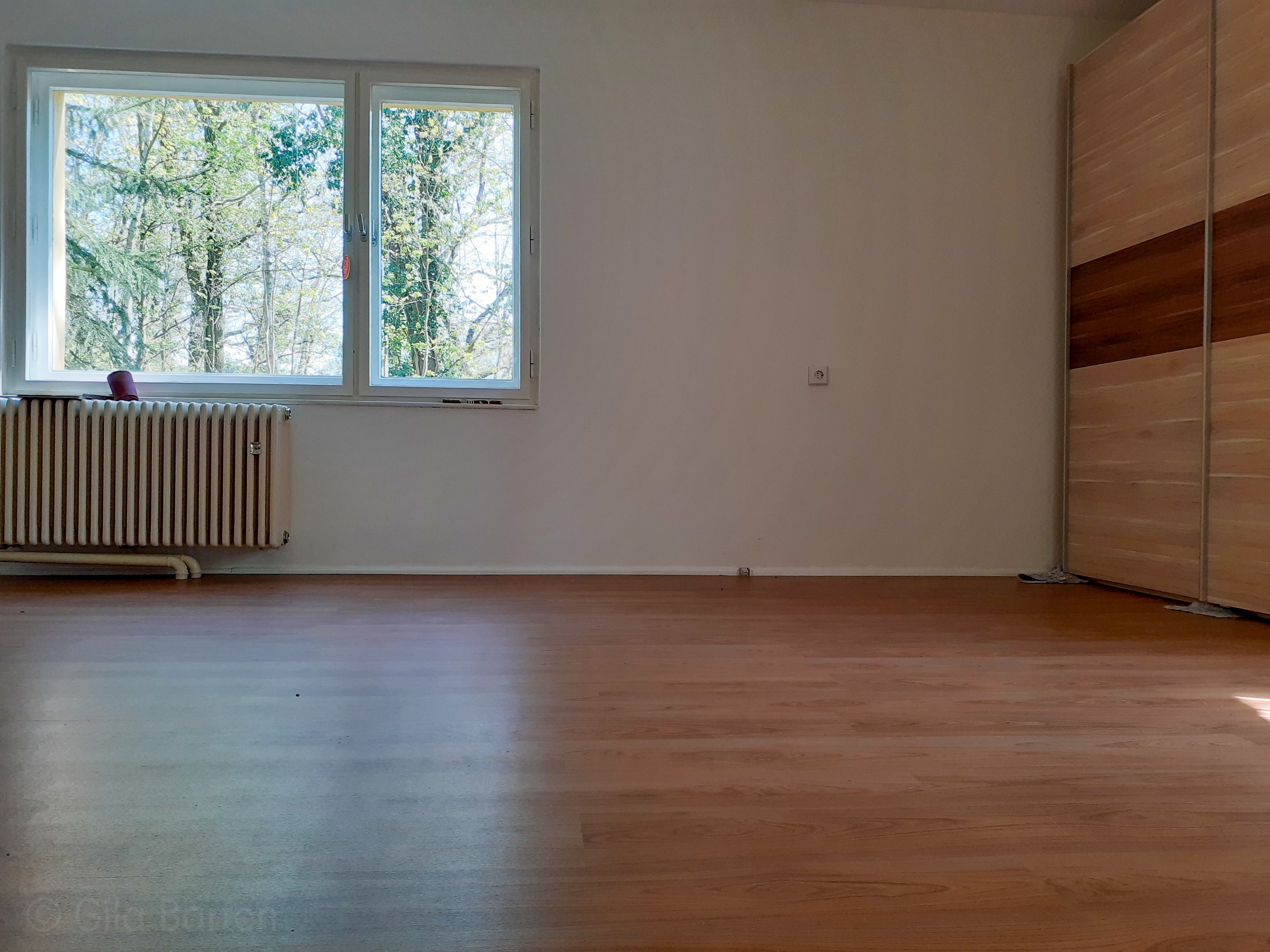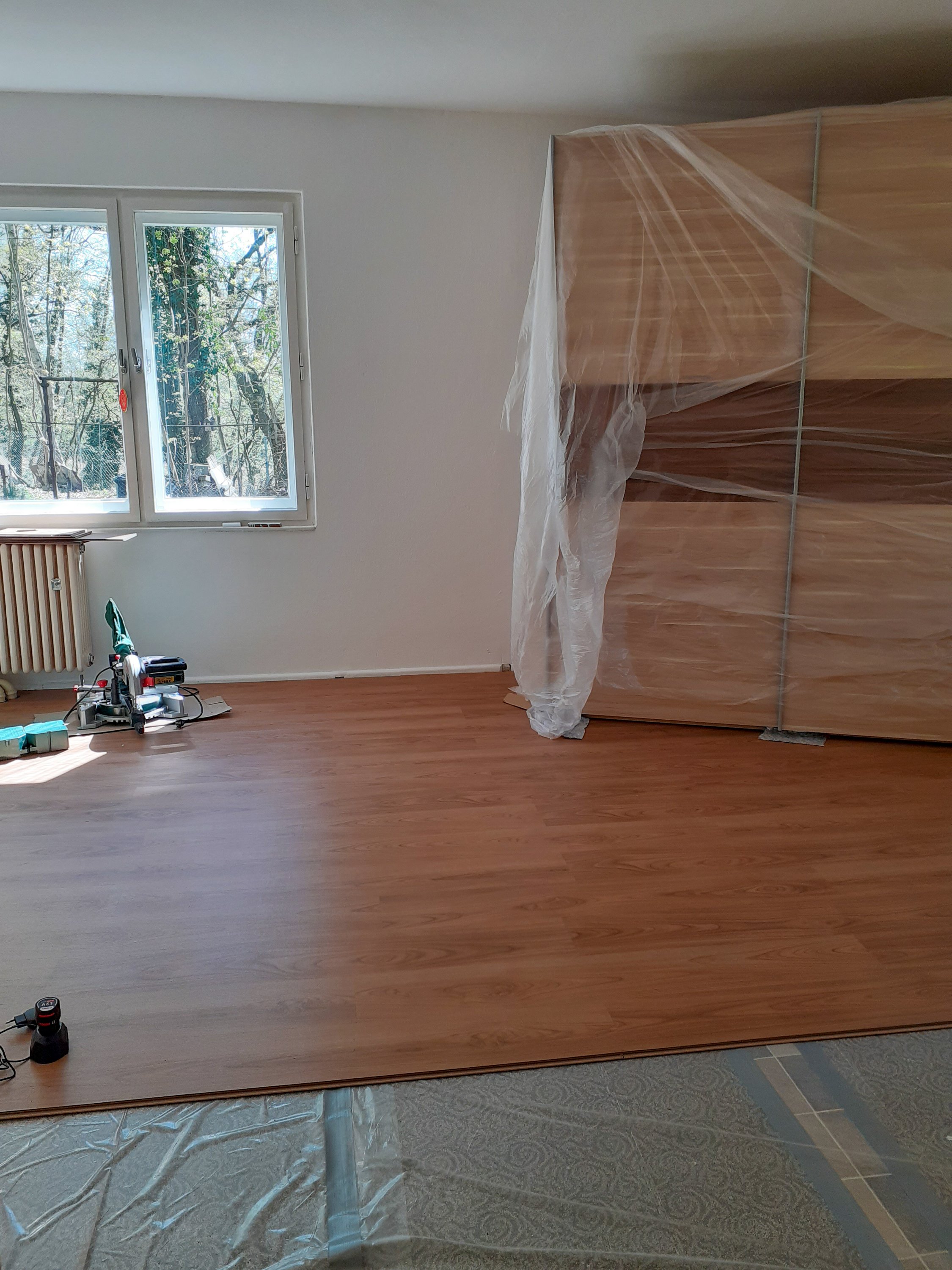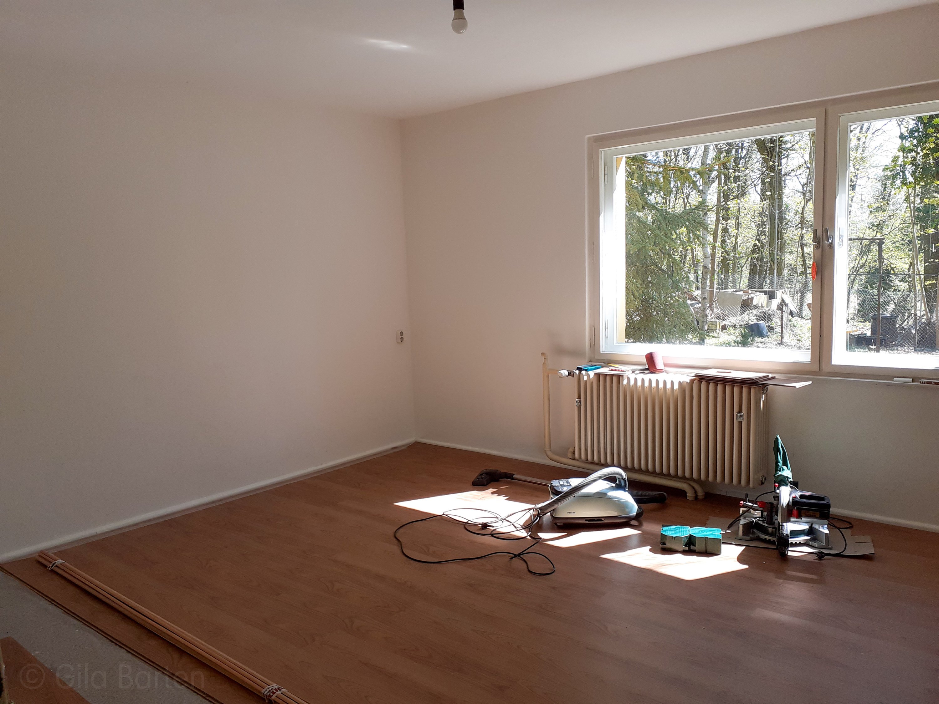 Hier war der Raum nicht mehr so schön und mit einer Wand geteilt, die nun weg ist. Decke und Wände sind angearbeitet und ein neuer Boden verlegt. Mit der Sonne, die durch zwei Fenster aus jeweils unterschiedlichen Himmelsrichtungen herein scheint, ist es ein schöner und „wohliger“ Raum geworden