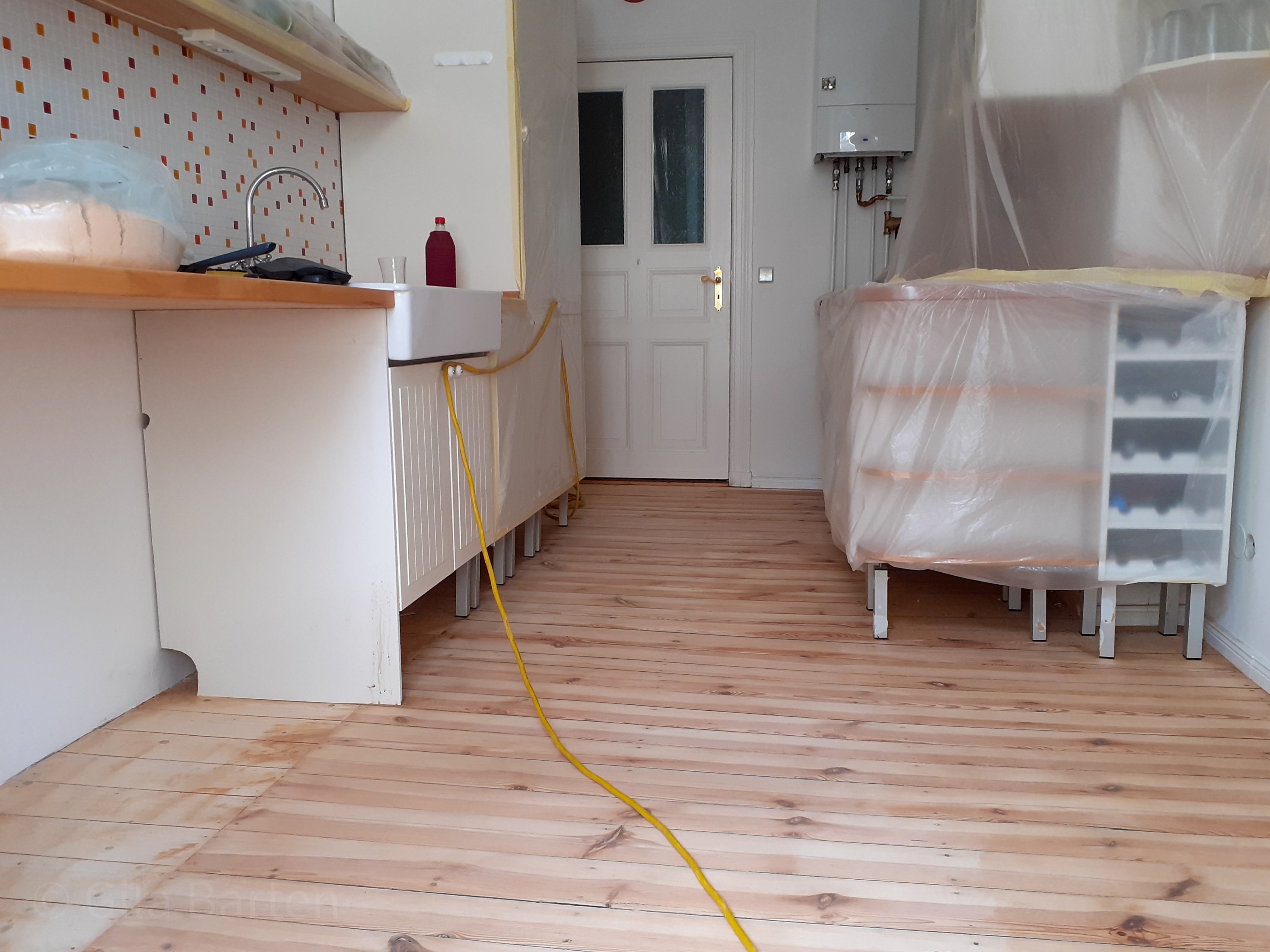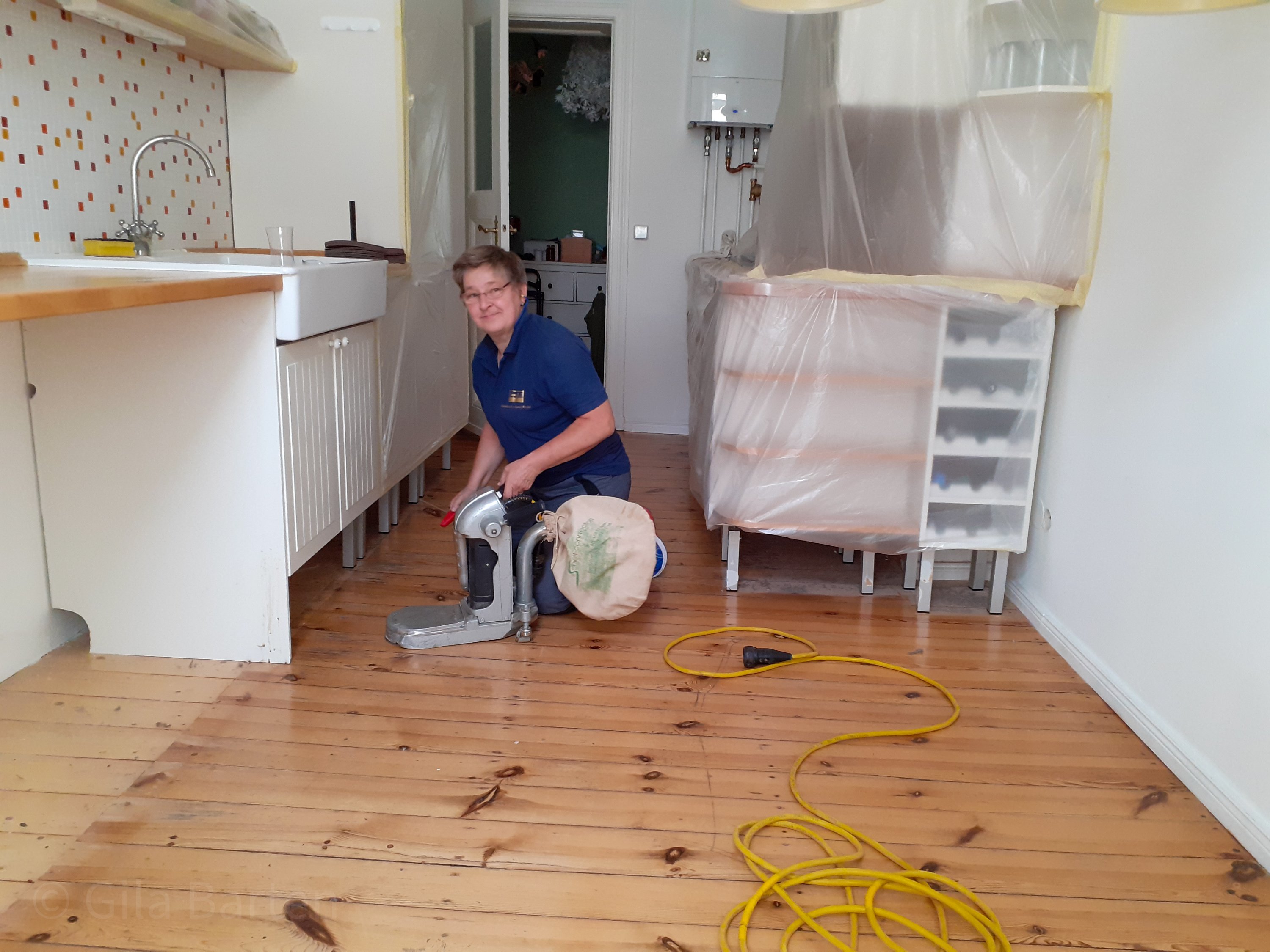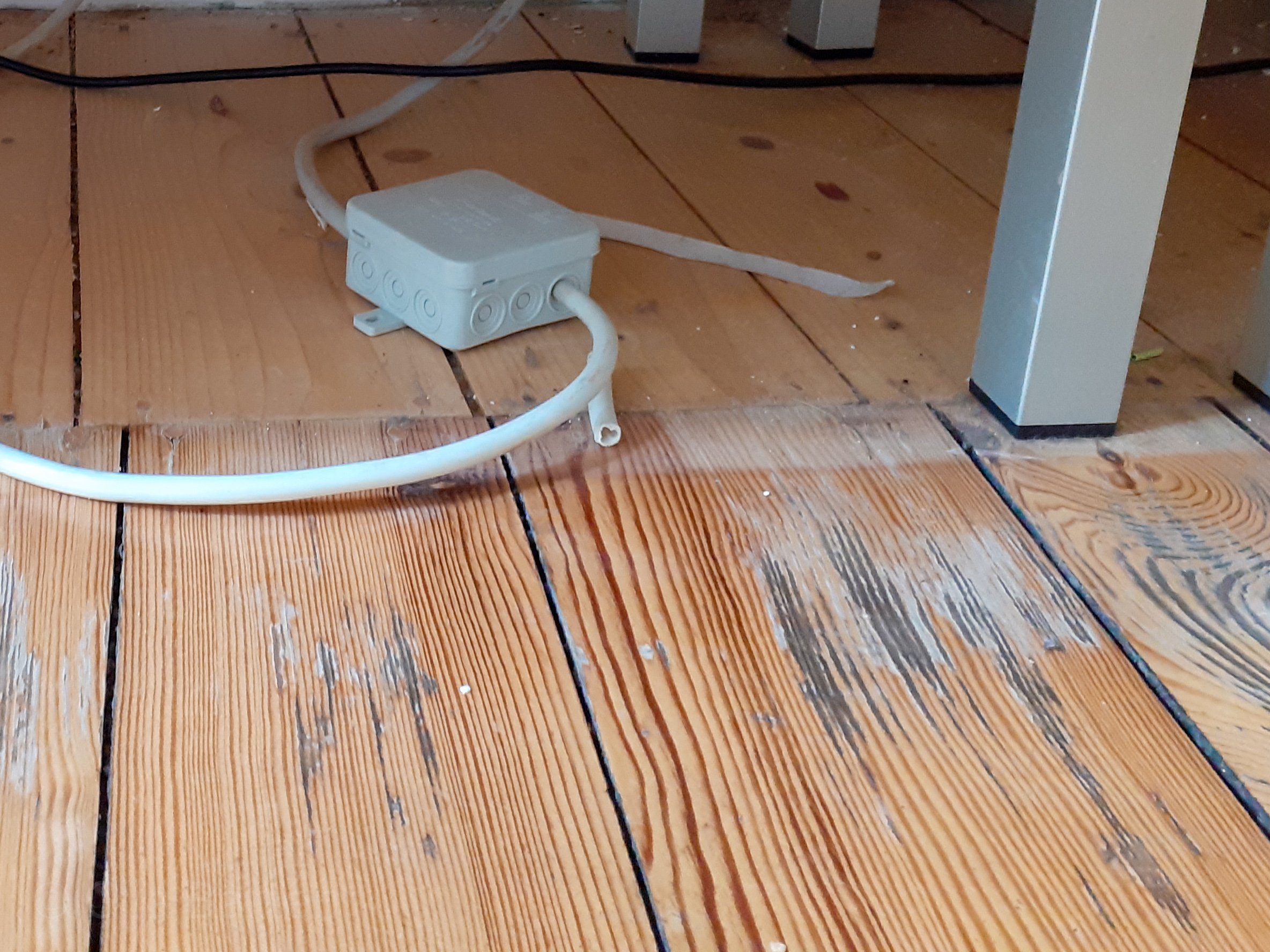 Hier wurde der Dielenboden überarbeitet und die Rohre sind nun hinter einem Kasten versteckt.