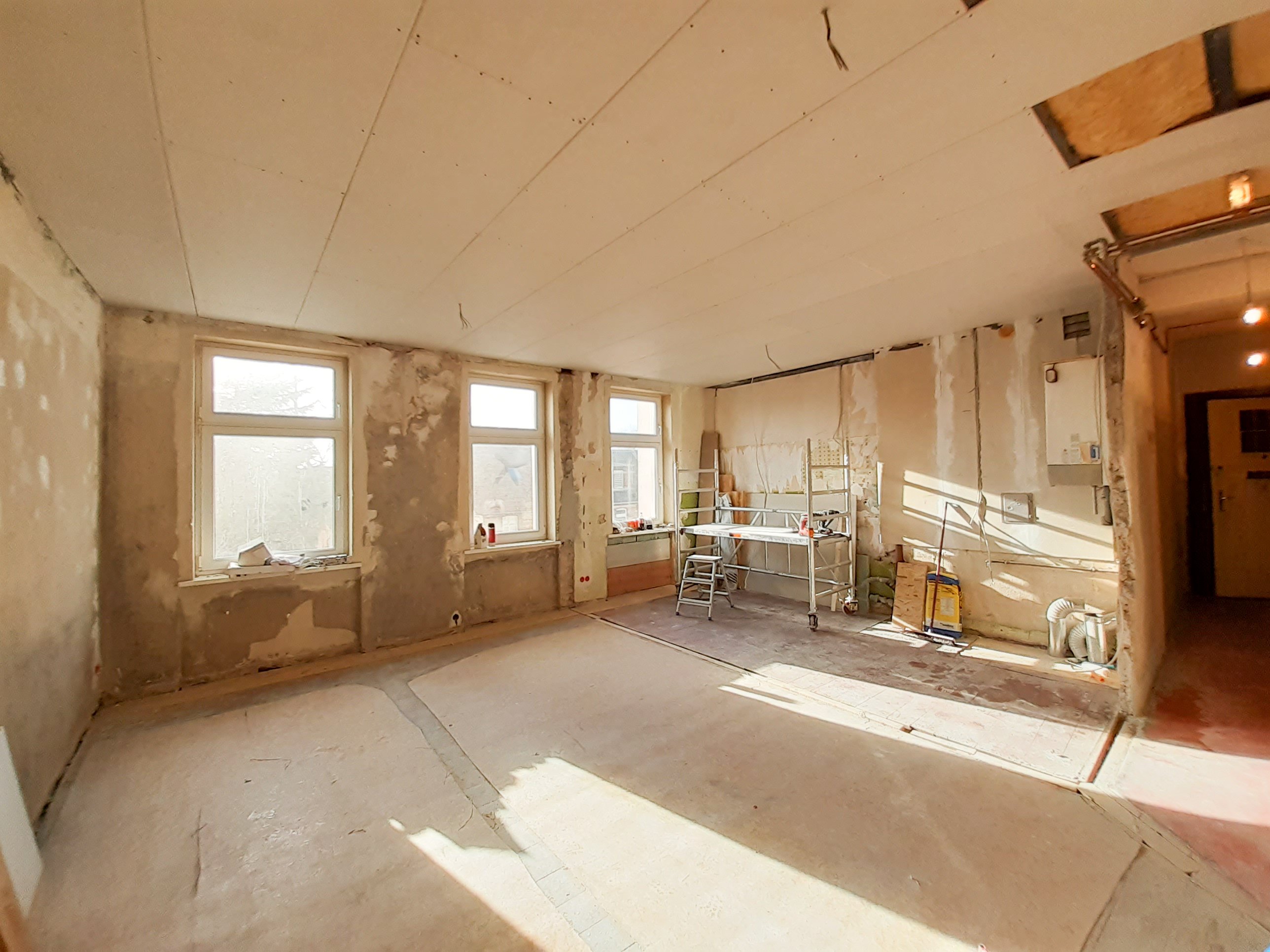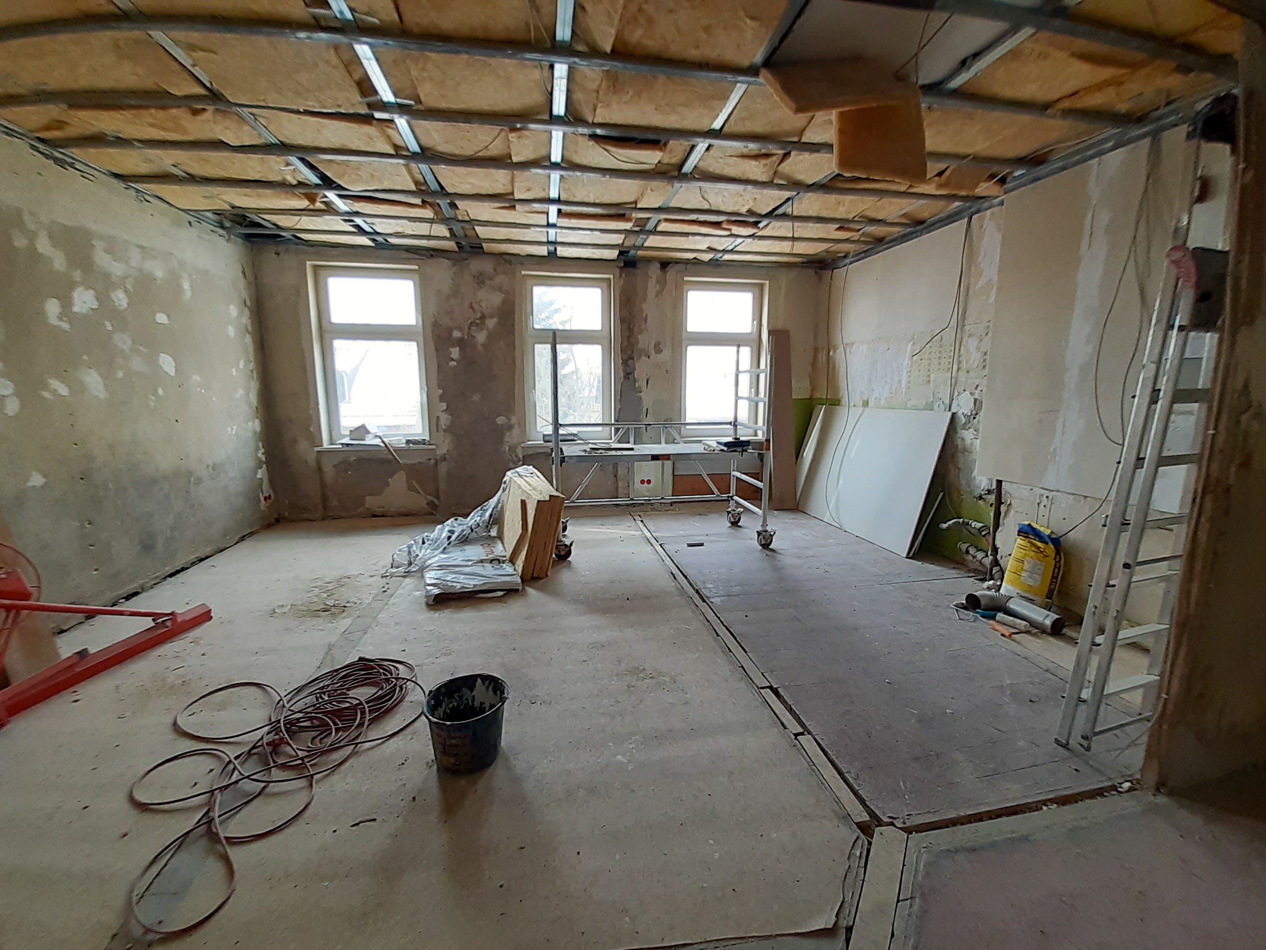 Nach der ersten Woche und der Überarbeitung der Befestigung und Ausrichtung der Streben an der Decke ist das Loch zum Dach geschlossen, die Dämmung in Ordnung gebracht und die Decke ist auch mit Gipskartonplatten geschlossen.