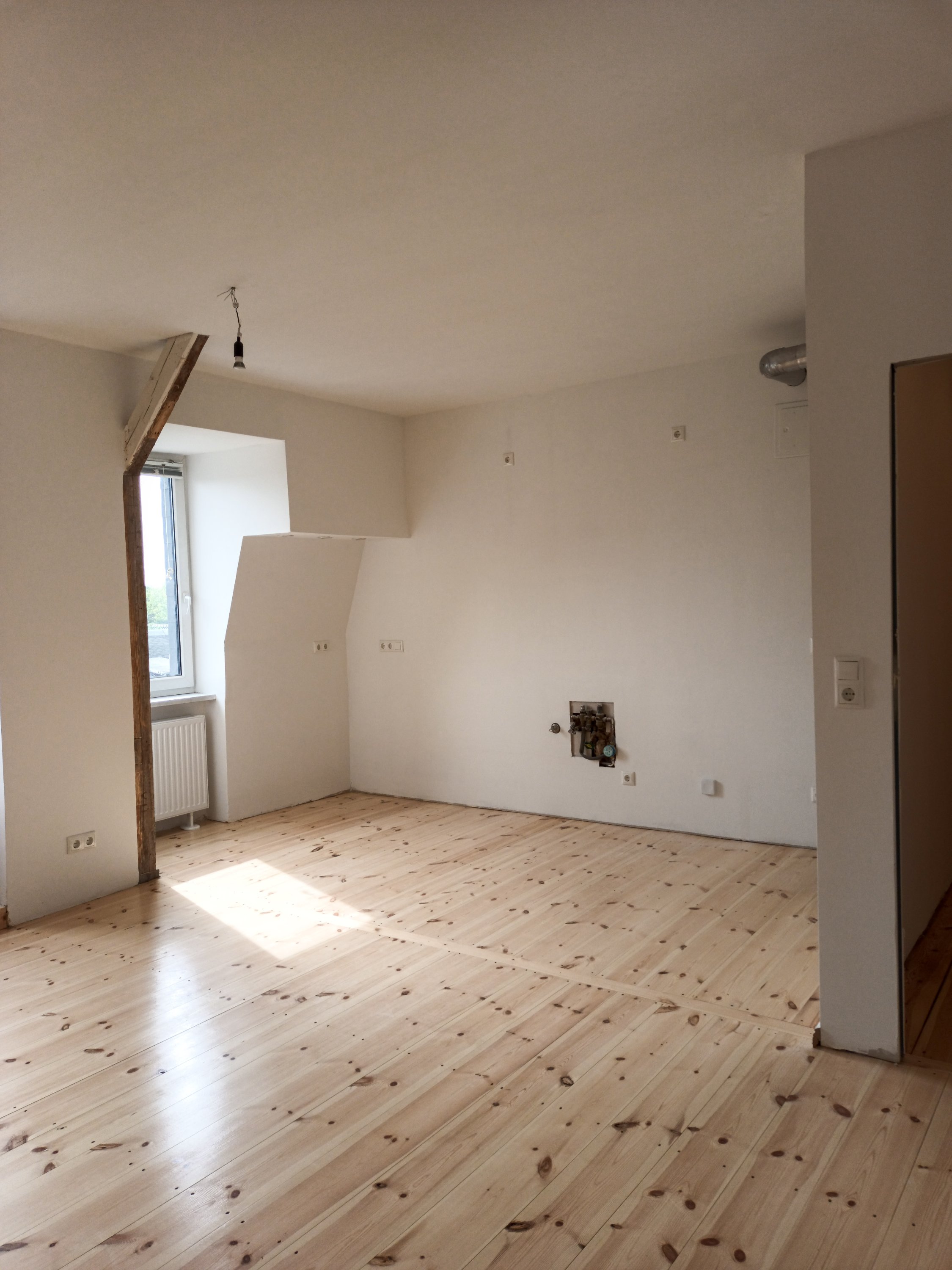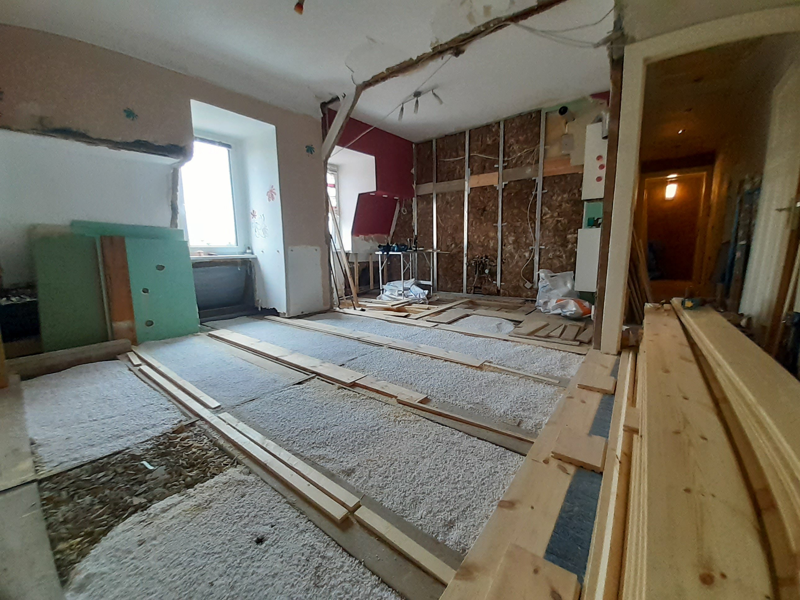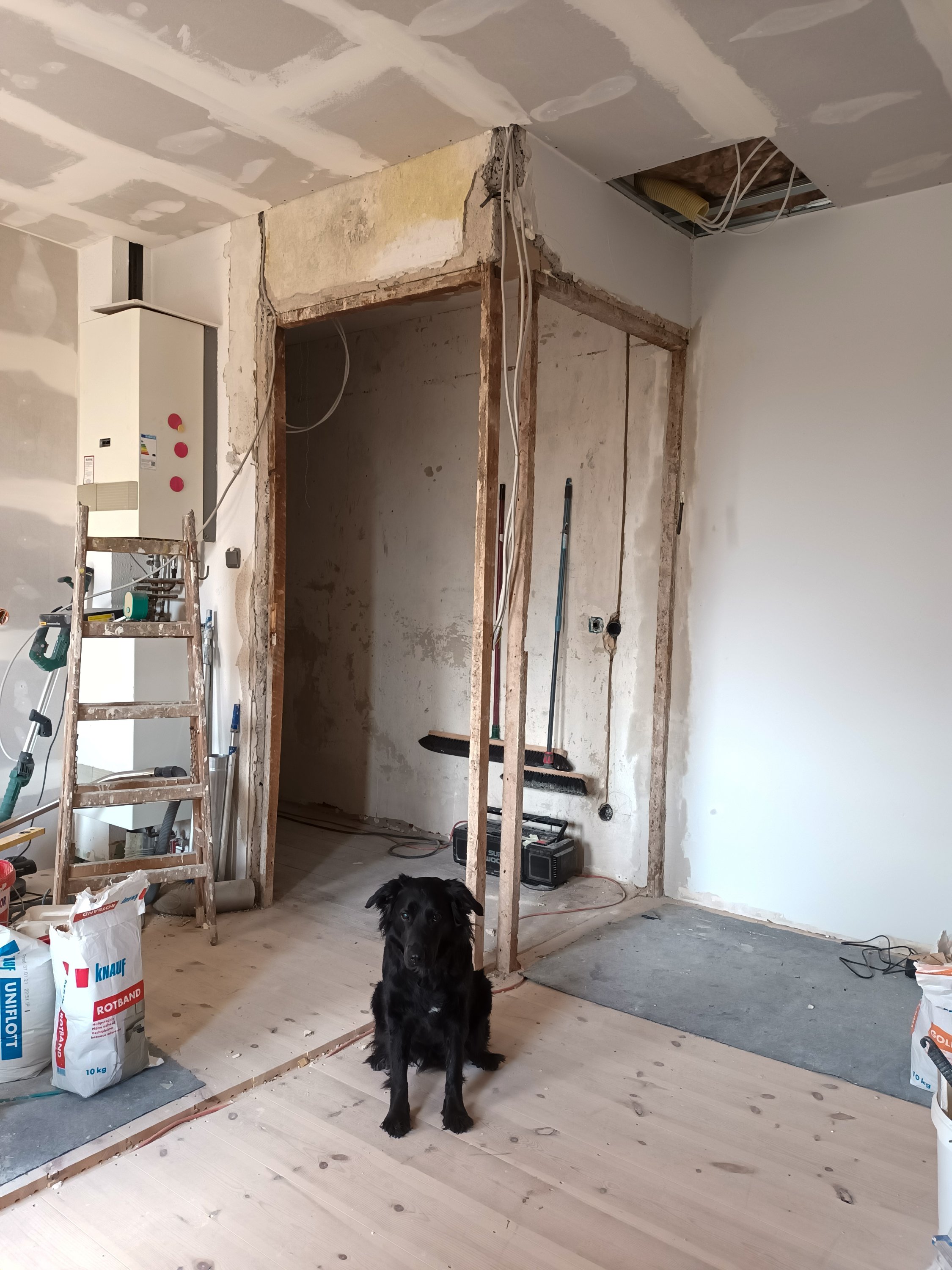 Hier wurde eine Wand zwischen der Küche und dem Flur entfernt. Anschließend wurde der alte Dielenboden ausgebaut und ein neuer Dielenboden eingebaut.