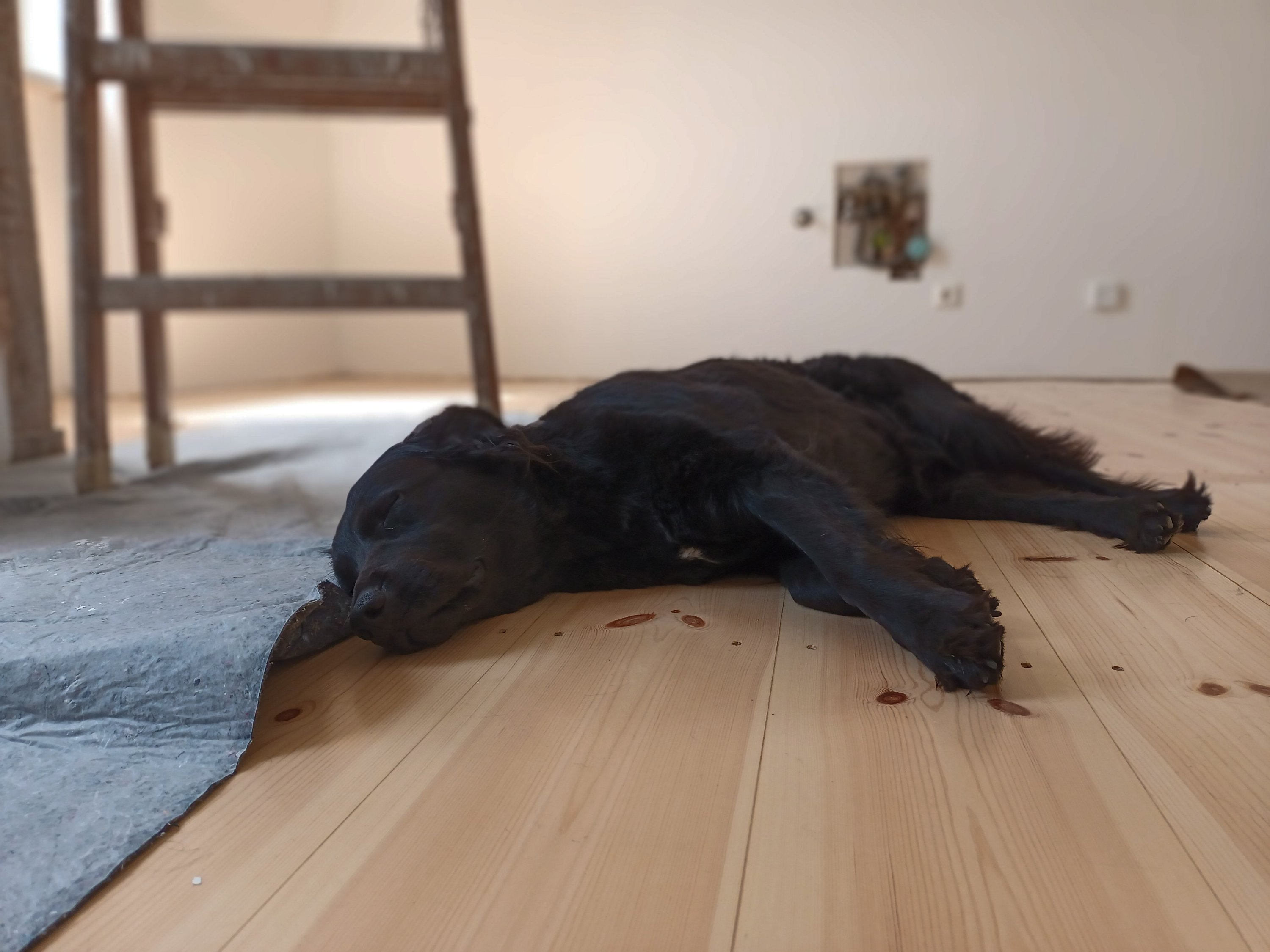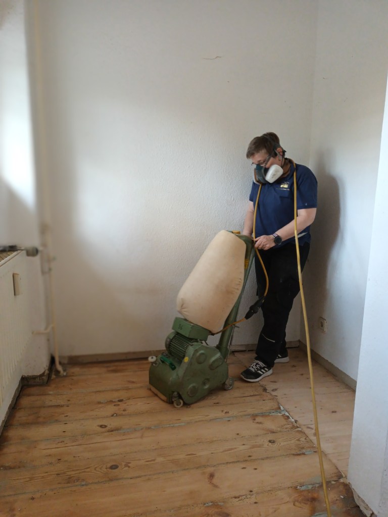 Nach dem Einbau des neuen Dielenbodens wurde eine Trockenbauwand, der Putz Ergänz und die Stromleitungen unter dem Putz/der Trockenbauwand gelegt. Anschließend der gesamte Boden geschliffen und versiegelt.