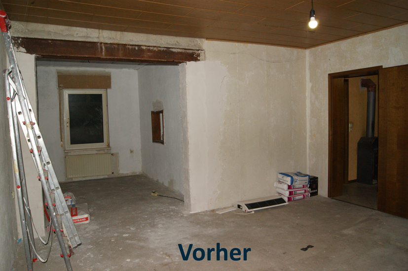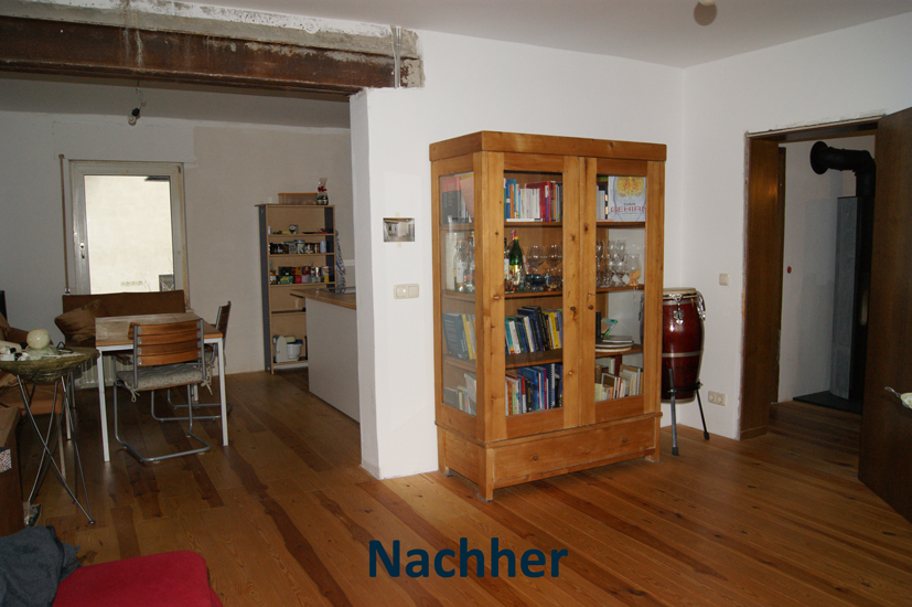 VorherNacherVorherNachherSanierungsbedürftigKüchenboden vorherKüchenboden nachherTerrasse vorherTerrasse nachherohne Küchemit KücheVorherEingangsbereich mit SchiebetürVorherNachherVorherNachherVorher / Rohbau mit alten Leitungen und 80ger Jahre DeckeNachher / Trockenbaudecke mit Dämmung, neue Stromleitungen und Dosen, gespachtelte Wände, Dielenboden mit Dämmung VorherNachherVorherNachherVorher / Wohn und EsszimmerNachher / Wohn und Esszimmer mit offener Küche